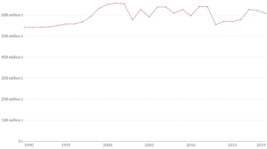 Just for comparison, here are Australia’s total greenhouse gas emissions (top) and coal use (in 1000s of short tons, a short ton being 907kg) over recent decades. Note that the baseline for the coal graph is not zero. The reduction between the peak around 2008 and now is a just a tad more than 25% and current consumption levels are the same as 30 years ago, not 270.