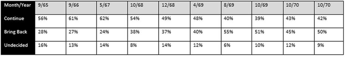 By 1968 support for Australia’s involvement in the war dropped to 54% in October and dropped even further to 49% in December. By April 1969, support for Australia’s involvement in Vietnam was at 48%, this dropped to 40% in August with an all-time low amount of support in October at 39%. A Roy Morgan Research table provides a comprehensive survey of how Australian opinion developed over the years.