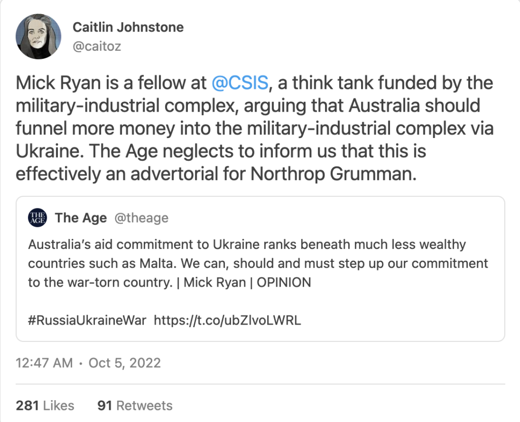 This first “expert” is Mick Ryan, whom I have written about repeatedly because he seems to feature in literally every single Australian news media piece geared toward propagandising Australians into accepting war with China as an inevitability which must be prepared for. Ryan is an Adjunct Fellow at the Center for Strategic and International Studies (CSIS), which is funded by military-industrial complex entities like Raytheon, Boeing, Lockheed Martin and Northrop Grumman, and is also directly funded by the US government and its client states, including Australia and including Australia and Taiwan. SMH and The Age make no note of this immense conflict of interest.