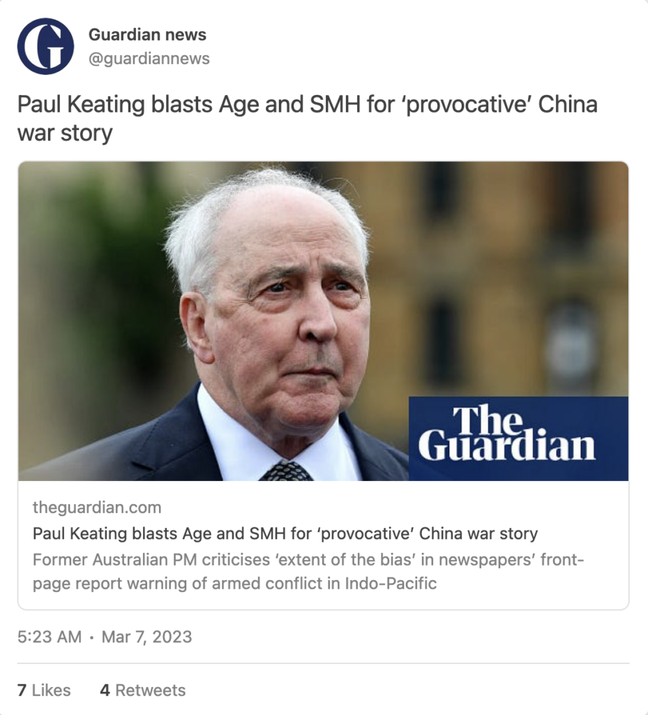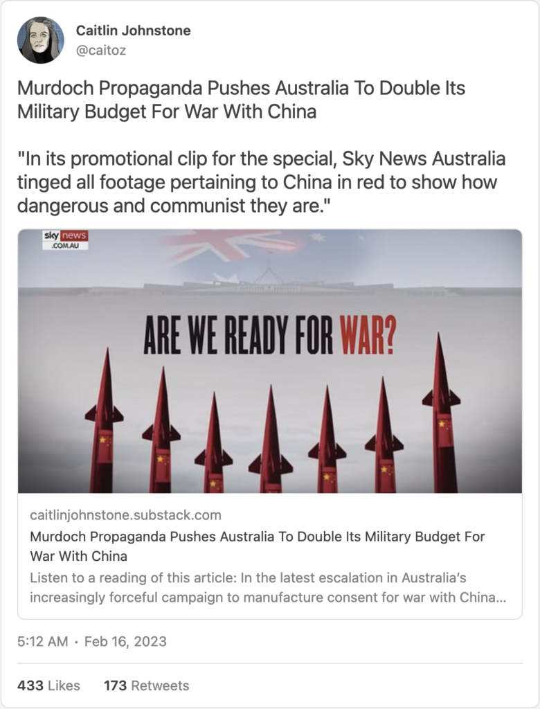 This is entirely in line with the appalling propaganda piece put out by Murdoch’s Sky News last month, which said Australia must double its military budget to prepare to back the US in a hot war over Taiwan.