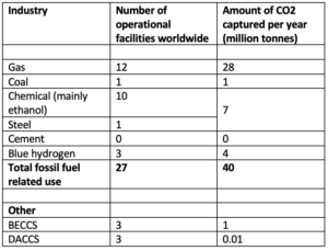 I have constructed the table below from information in the IEEFA report. The 40 million tonnes of CO2 captured per year from fossil fuel industries represents about one-thousandth of the current CO2 emissions per year (that’s just CO2, not total greenhouse gases). In fact, it’s about only one-seventh of the annual increase in CO2 emissions over the last decade.