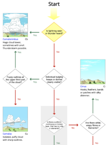 I think most of us look at clouds now and again and wonder ‘what cloud is that?’ The World Meteorological Association’s International Cloud Atlas (who knew?) has a simple cloud identification guide to help you (top part above). Memorise this and you won’t have your head in the clouds, you’ll have the clouds in … well never mind.