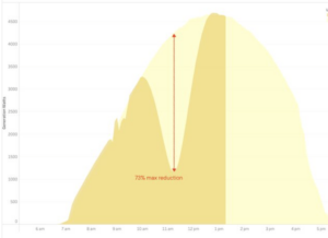 Last week’s solar eclipse reached its 76% peak in Perth at 11.30am – three-quarters of an hour before the solar noon. One careful monitor of his home solar system recorded a 73% drop in power output (dark yellow in the graph below) compared with the previous day (light yellow); both days were pretty cloudless. The total duration of the dip in his system’s output was about three hours, not a problem for any domestic or commercial system with decent batteries. Plus, although solar eclipses occur every 18 months, the same place on Earth experiences one much less often.