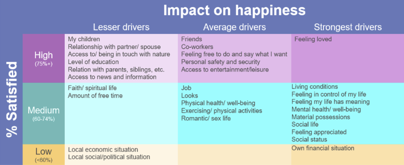 Ipsos measured the relationship between all respondents’ reported level of overall happiness and level of satisfaction with 30 aspects of life. This analysis helped rank order all 30 aspects of life measured in terms their relative impact on overall happiness. It brings to light that the top five drivers of happiness are, in order: feeling one’s life has meaning, feeling in control of it, mental health and well-being, social life, and living conditions.
