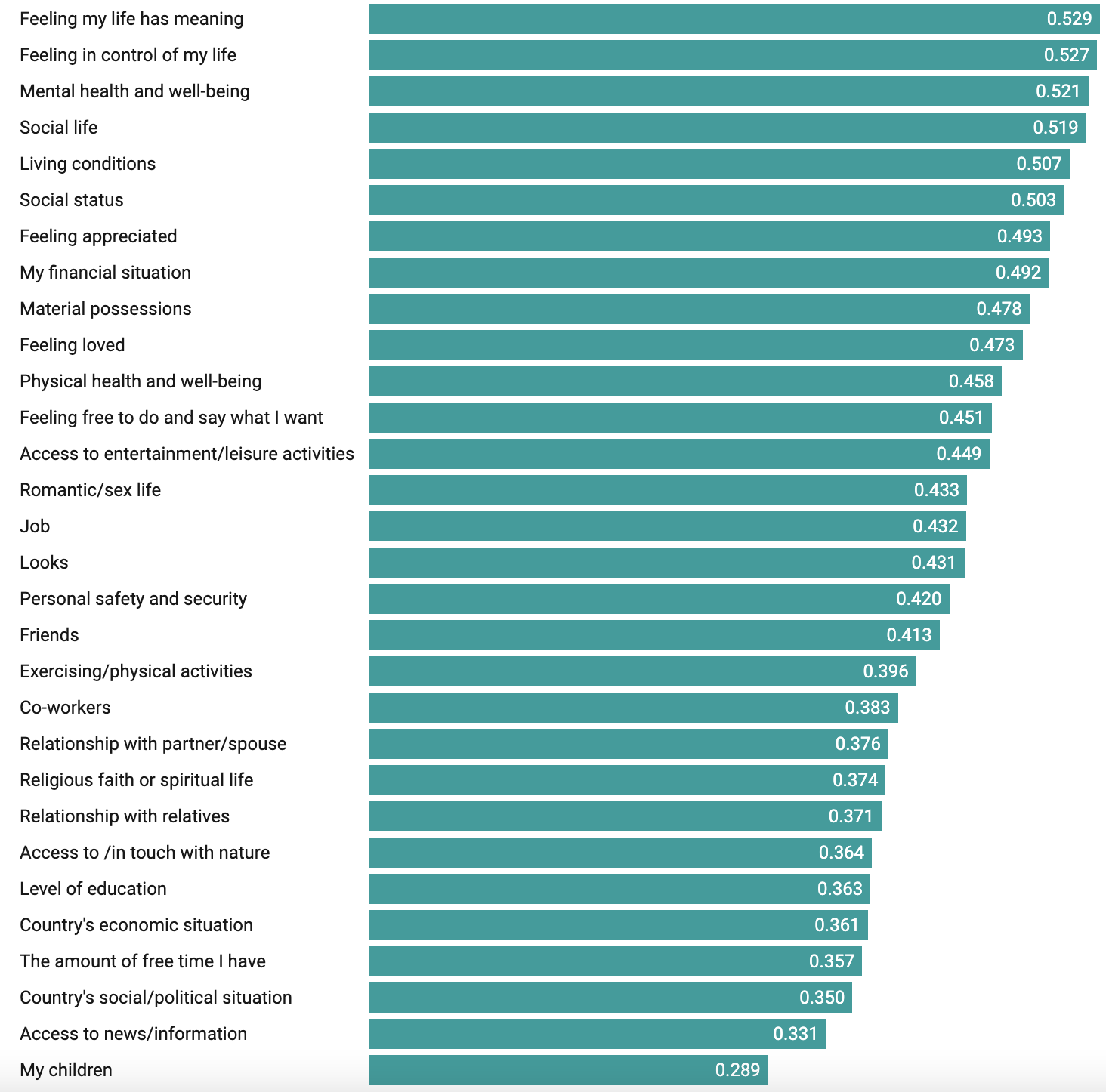 Correlation between satisfaction with each aspect of life and reported happiness (R2)
