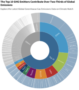 The hyperlink leads to an interactive version of the pie chart that displays details for every country. It also provides access to another interactive feature, developed by ClimateWatch, that shows historical emissions for each country by year and the cumulative amount to 2021, both per capita and per unit of GDP. Graphs and databases such as this are an incredible resource if you want to keep an eye on greenhouse gas emissions.
