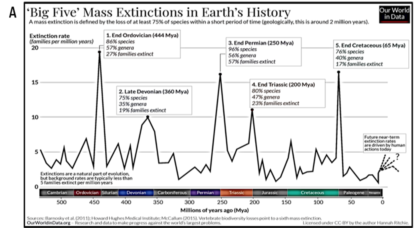 Figure 1. A. The five great mass extinctions in the history of Earth; B. IPCC climate projections to 2100 (after Will Steffen).