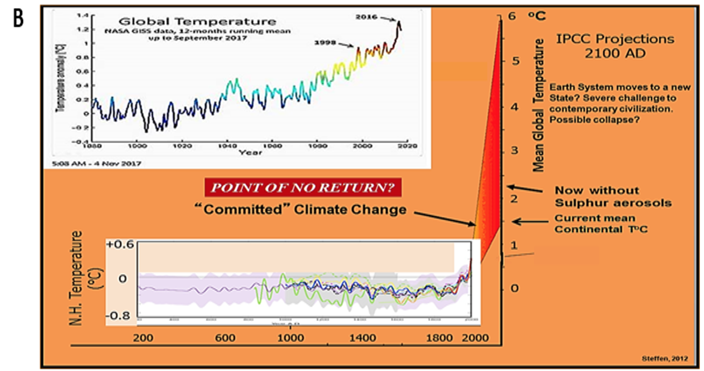 None of these infringements falls within the category of ordinary human offences, rather their consequences for the Earth’s life support system are orders of magnitude larger than even their perpetrators could imagine, namely a major mass extinction of species analogous to the end-Ordovician (86% species extinguished), Permian-Triassic (96% species extinguished) and Cretaceous-Tertiary (76% species extinguished) (Figure 1A) consequent on carbon emission rates some 9–10 times higher than those during onset of the Palaeocene-Eocene Thermal Maximum.