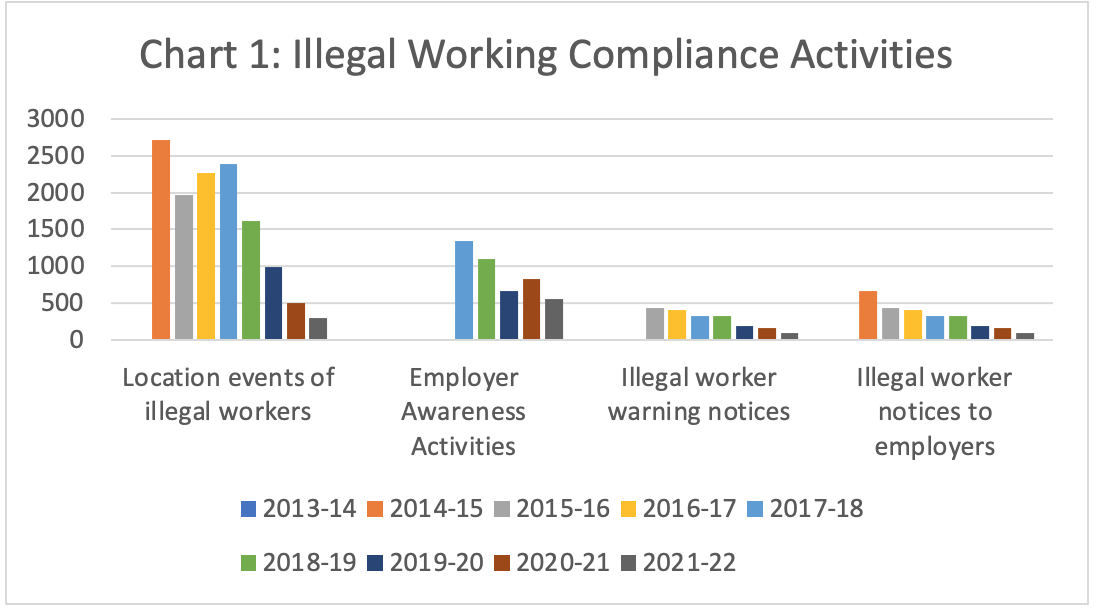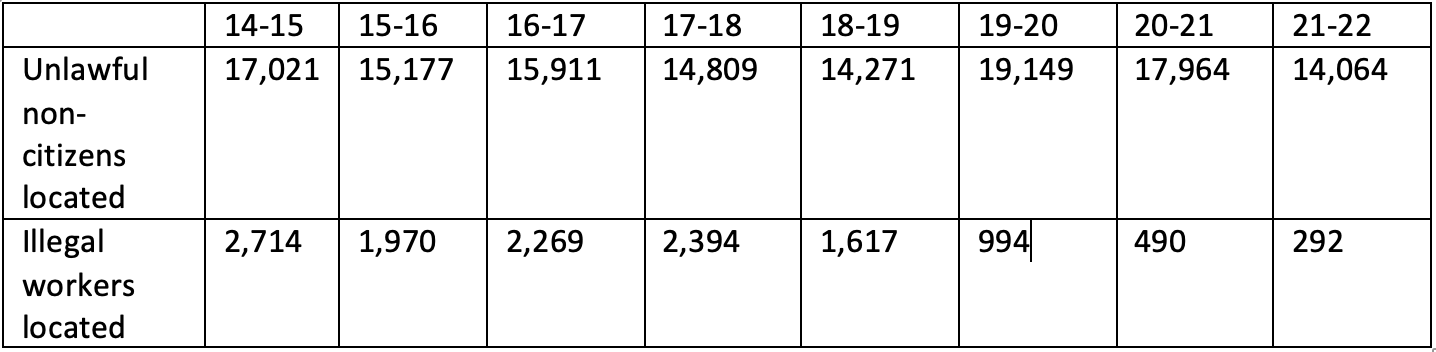 The location of illegal workers by ABF has fallen steadily since 2014-15 (see Table 1).