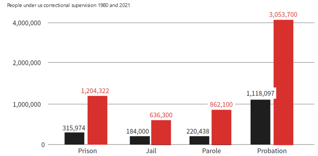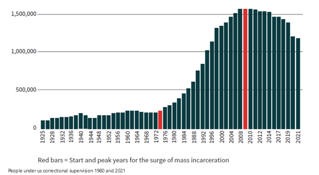 How on earth has the land of the free so incarcerated and criminalised itself? Much is owed it seems to President Nixon who in the 1970’s infected the US with a war on drugs opening the gateway for what has become an abominable form of human rights abuse - minimum mandatory sentences. This weaponising of the judicial process not surprisingly spread rapidly into state legislators. New York Mayor Nelson Rockefeller perfected the art in the mid 1970s with his infamous mandatory 15 year sentence for not only drug dealers but also for hapless addicts. As the following graph shows, the increase in the prison population (which numbered a ‘mere’ 300,000 in 1972) that followed Nixon’s war was nothing short of extraordinary in its speed and numbers involved.