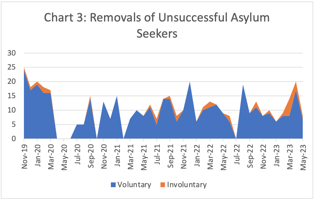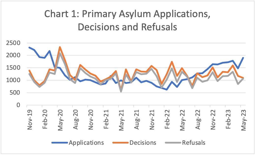 In May 2023, primary asylum applications were 1,896, the highest monthly level since international borders re-opened. 1,091 primary applications were finalised and 1,065 were refused, a very high refusal rate of over 97 percent (see Chart 1).