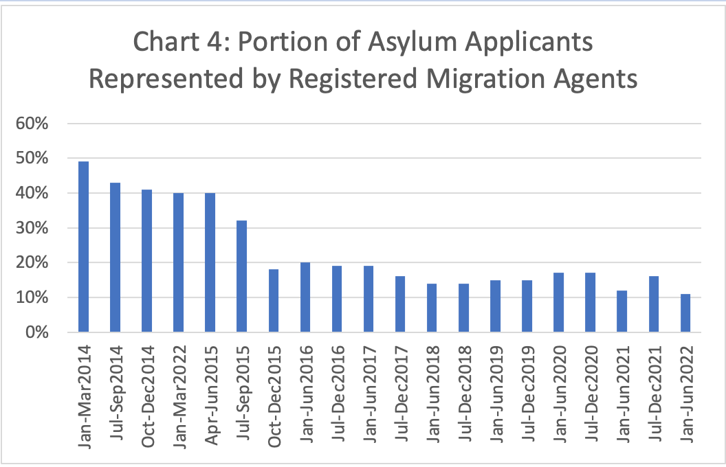 Thirdly, an important part of discouraging unmeritorious asylum applications is to target agents and organisers involved. The portion of registered migration agents putting their names to asylum applications has fallen significantly since the scam started in 2015 (see Chart 4).