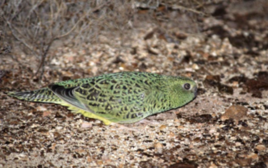 Night Parrots are ground dwelling (hence vulnerable to feral cats) and nocturnal, of course. They prefer spinifex habitat (see below), which is unfortunately susceptible to unmanaged bushfires.