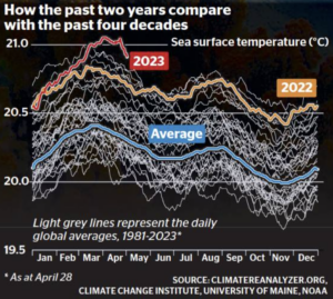 The figure below provides a very clear illustration of what is happening. The blue line displays the average daily sea surface temperature for each year between 1981 and 2023 (the light grey lines are the individual daily averages). The orange line displays the daily temperatures for 2022, which are throughout the year about 0.5oC higher than the average for the previous forty years. The red line for 2023 clearly shows that in March and April the sea surface temperature was about 0.7oC warmer than the previous four-decade average.