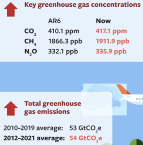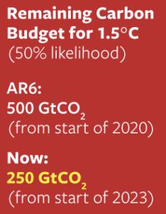 The remaining carbon budget to keep warming under 1.5oC has halved between the beginning of 2020 and the beginning of 2023 and at current CO2 emission rates will be exhausted in 6 years. And that’s for just a 50% chance of staying under 1.5, which the authors interestingly describe as a ‘good’ chance.