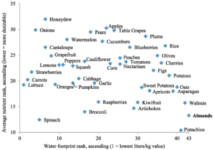 While there was variation related to both year and place, it took an average of 12 litres of water to produce every almond in California between 2004 and 2015. That is not a typo:12 litres for every single almond nut or 10,000 litres for every kilogram. On the other side of the farmer’s balance sheet, almonds have extremely high nutritional value and provide the farmer with a relatively high income per kg produced.