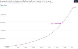 - The world has produced 41% of the cumulative emissions up to 2021 since the United Nations Framework Convention on Climate Change was signed in 1992. Hardly a demonstration of great success for the UNFCCC. The best one can say is that while the curve was getting steeper and steeper for 160 years, since about 2010 it looks to be linear. So maybe after 20 years of work the UNFCCC stopped us accelerating towards the cliff. Now we are simply hurtling to oblivion at a steady speed.