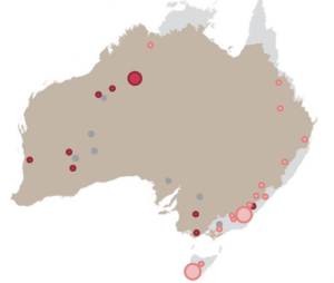 Australia was not spared, with about 25 lakes (the darker red dots) and reservoirs (the pink dots) experiencing losses The grey dots represent lakes and reservoirs with no change in water storage over the period. The brown on the map represents arid areas and the grey humid areas.