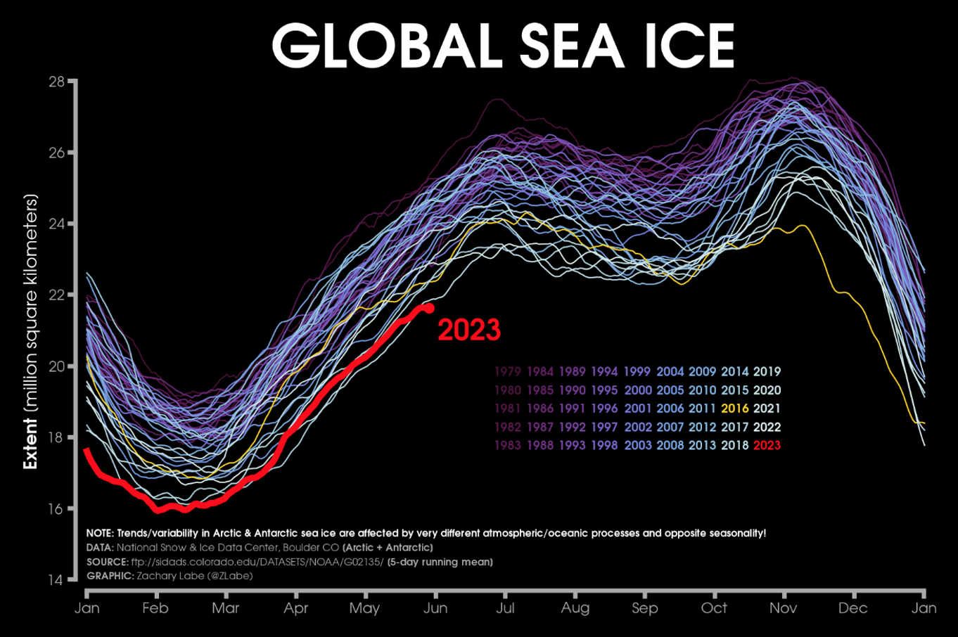 - Accelerating loss of sea ice in both Arctic and Antarctic, to the lowest levels ever seen. This leads to more dark, open ocean which also accelerates the rate of heating.