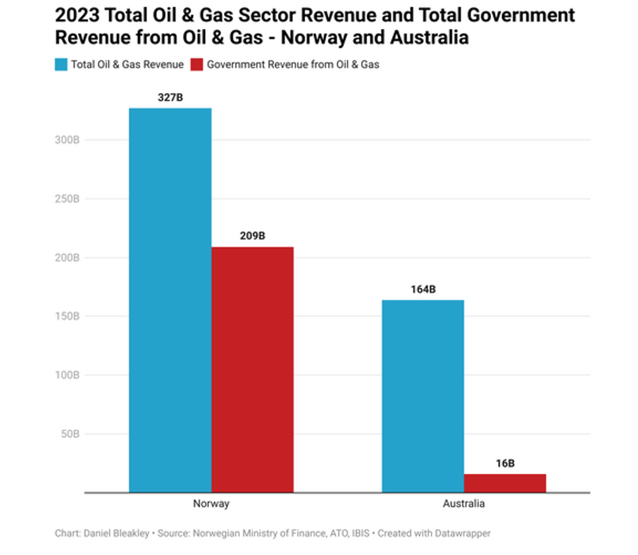 While there is the $2 billion allocated to promote green hydrogen there is no serious spending of political risk capital to further accelerate the transition to carbon neutrality. Witness the bizarrely large subsidies left flowing to the carbon economy. The mining industry still benefits to the tune of $3.5 billion by way of the diesel fuel excise rebate with no thought in the budget it seems of turning it into an engine electrification scheme. Then there is the far larger indirect subsidy from the derisively low taxation of most oil, gas and coal mining companies. Here an extraordinary lack of courage is displayed in the budget’s incrementally small increase in the oil (and gas) resource tax which is to produce a mere $2.7 billion over 5 years. The word ‘mere’ is justly applied. Well documented is the national scandal over our fire sale of our massive gas assets. As Michael West (see graph below) and others have pointed out, two of the world’s largest exporters of gas Norway and Qatar derive vastly more revenues from oil and gas than Australia.