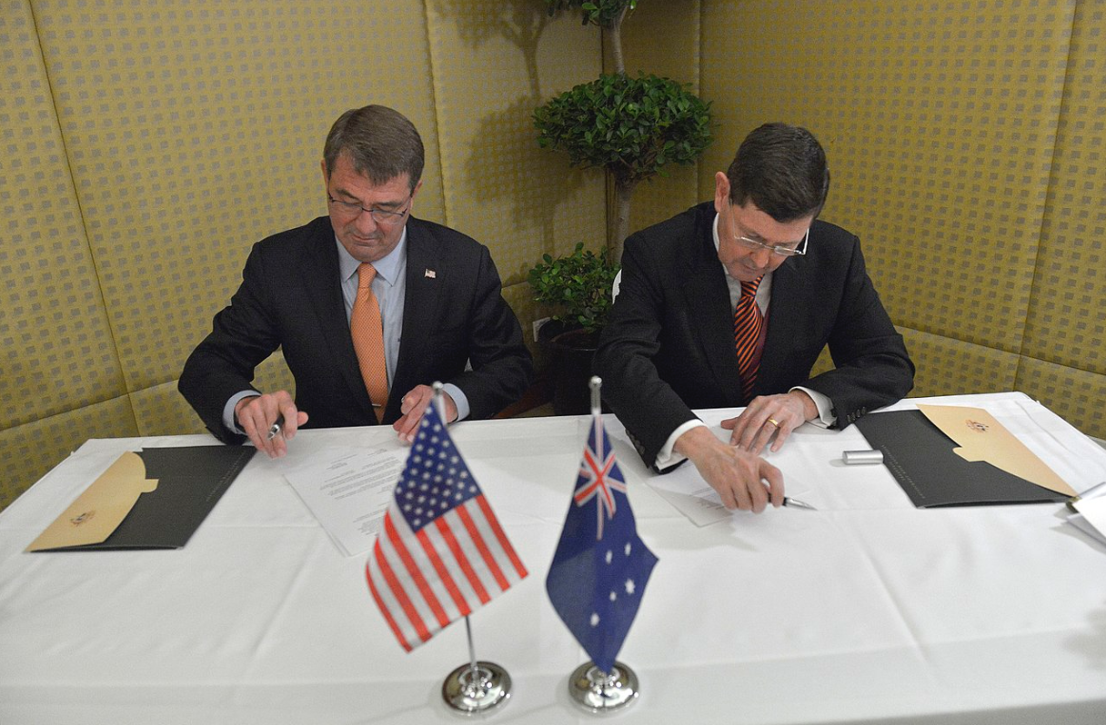 Figure 3. U.S. Defence Secretary Ash Carter, left, and Australia’s Minister of Defence Kevin Andrews sign a Memorandum of Understanding on Agreed Facilities and Areas, Singapore, 30 May 2015