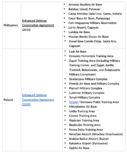 Table 1 identifies recent agreements with five US allies which publicly state which Agreed Facilities and Areas to which US forces are to have access under such agreements. Three such allies – Hungary, Norway, and Poland – are NATO allies; another, the Philippines, is returning to close allied status after an interregnum; and a fifth, the Islamic Republic of Afghanistan, was a close ally of the United States until very recently. (In addition, Papua New Guinea has recently signed a Defence Cooperation Agreement with the United States. According to as-yet unconfirmed media sources with access to the reported text of the agreement, five PNG facilities, including two maritime ports and three airports, are included as Agreed Facilities and Areas.)
