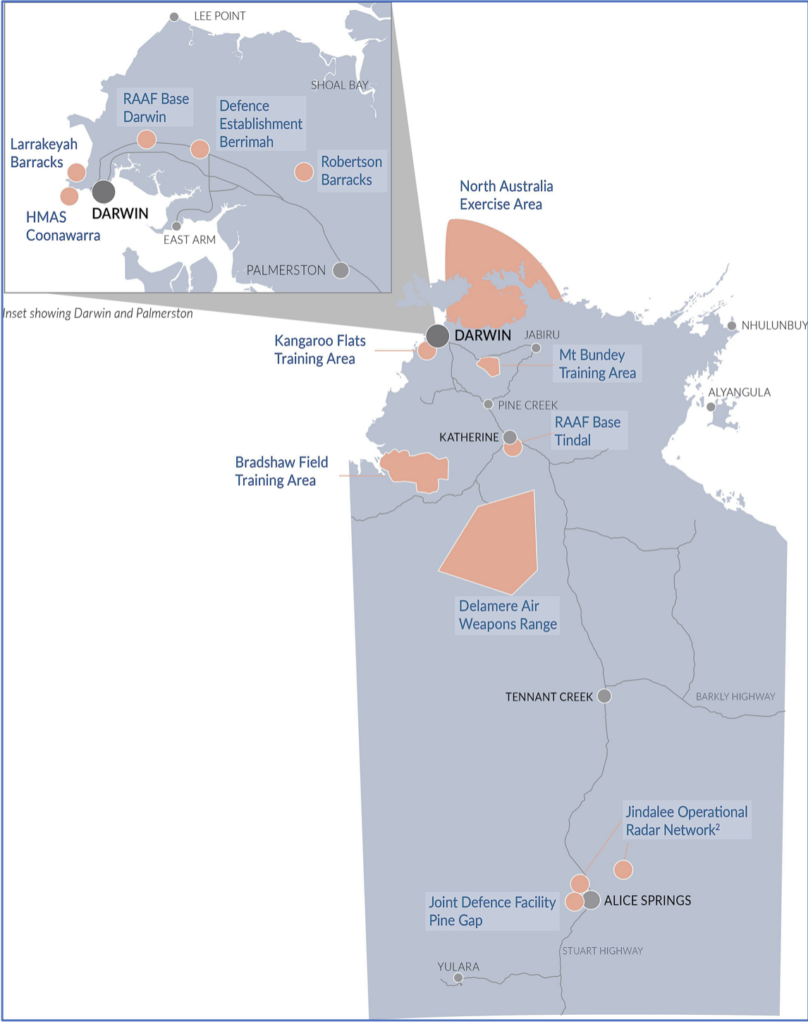 Figure 2. Major defence facilities in the Northern Territory (with the U.S. Bulk Liquid Storage Facility at East Arm, Darwin, should now be added).