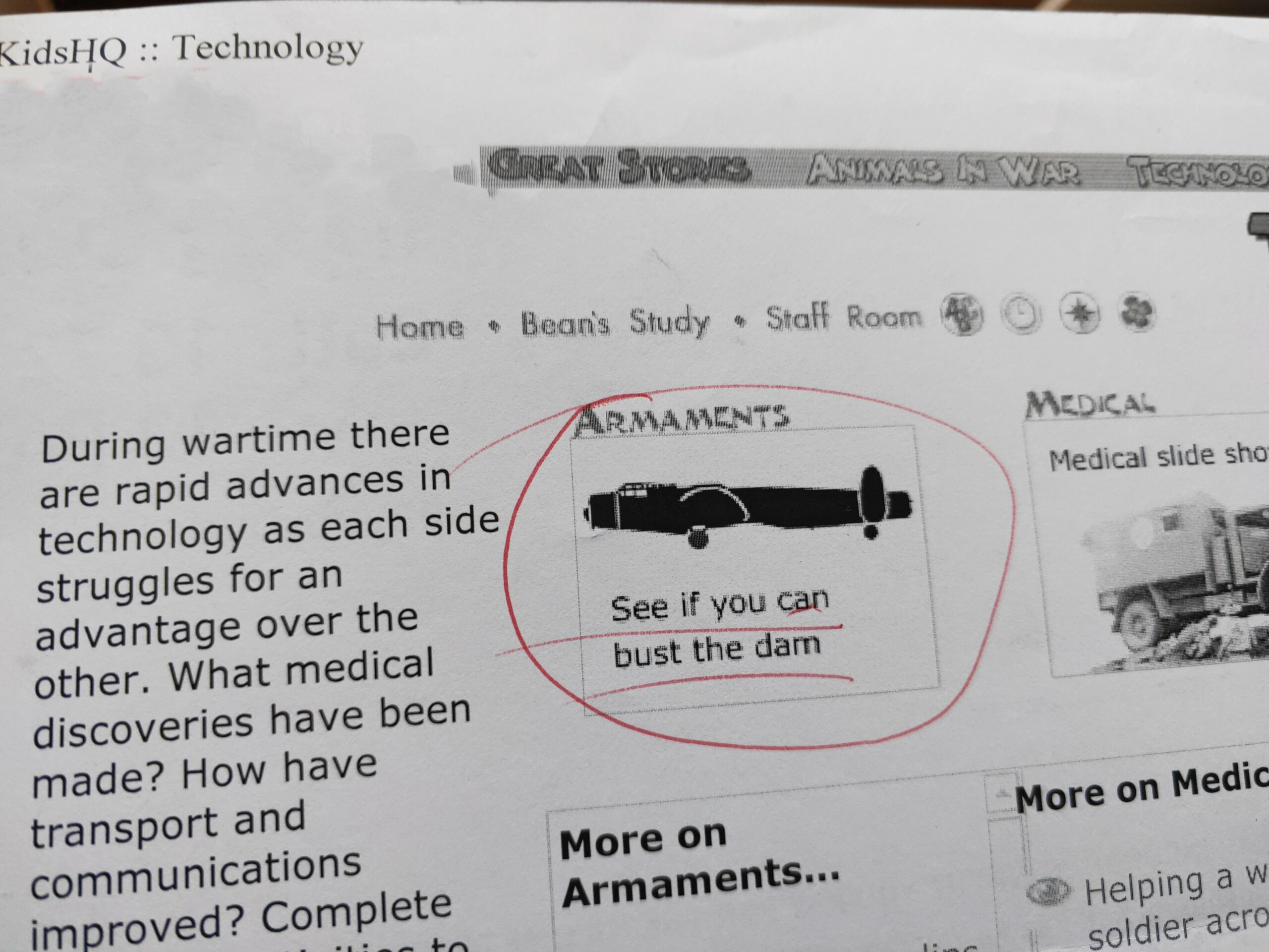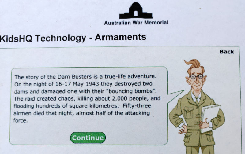 Around a decade ago, the Memorial’s online “KidsHQ – Armaments” activities included a dam-busting feature, under the heading “Great Stories”. The preliminary information stated “The story of the Dam-Busters is a true life adventure. On the night of 16 – 17 May 1943 they destroyed two dams and damaged one with their ‘bouncing bombs’. The raid created chaos, killing about 2,000 people, and flooding hundreds of square kilometres. Fifty-three airmen died that night, almost half of the attacking force.” The activity challenged young readers with “See if you can bust the dam”, and so it proceeded to engage them.
