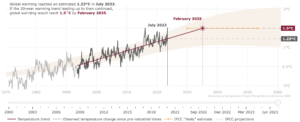 The last estimate produced by the Intergovernmental Panel on Climate Change (IPCC) was that the 30-year average would breach 1.5oC somewhere between 2035 and the mid 2050s. However, more recent data (graph above) indicates that if the trend of the last 30 years continues – and there’s little reason to believe that it will be any slower over the next decade – the 30-year average will hit 1.5oC at the very beginning of the IPCC’s estimate, in February 2035. This is similar to other findings that the anticipated consequences of global warming are occurring at the early end of previous predictions, or even sooner