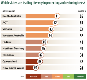 The Trees Scorecard does not make pretty reading: no government received a ‘Good’ or ‘Very good’ score. South Australia and the ACT were closest to the top of the tree with scores over 60%, while NSW (24%), Queensland (32%) and the Northern Territory (34%) were scratching around in the leaf litter. NSW failed to score over 50% on any criterion.