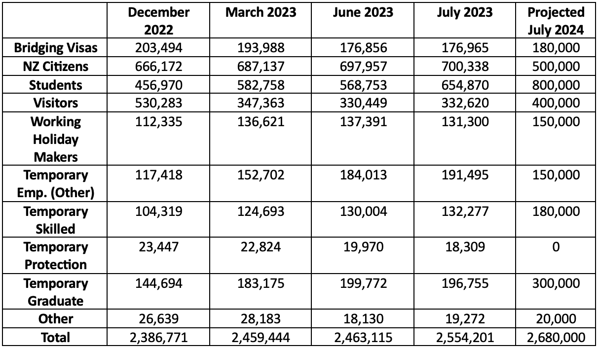 At end July 2023, there was an all-time record 2.554 million temporary entrants in Australia. The crucial policy question is whether that will be a peak or whether the number of temporary entrants in Australia will keep rising? If the latter, what will that mean for the number of temporary entrants in ‘immigration limbo’ – unable to secure permanent residence and unwilling to depart?