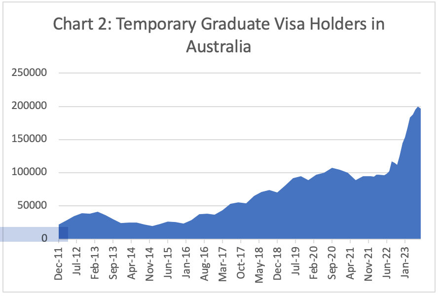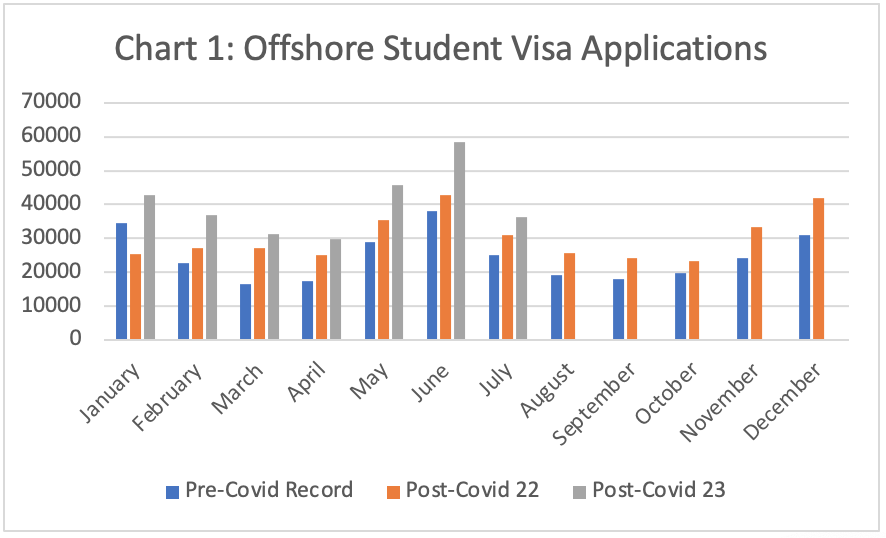 Offshore student visa applications have grown at record rates over the past 18 months (see Chart 1). That has enabled student numbers in Australia to rise to a record 654,870 by end July 2023.