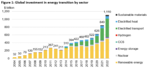 The increasing penetration is driven by increasing investment in the energy transition generally, not just wind and solar. For the first time, in 2022 investments in the energy transition (US$1.1 trillion) equalled fossil fuel investments.