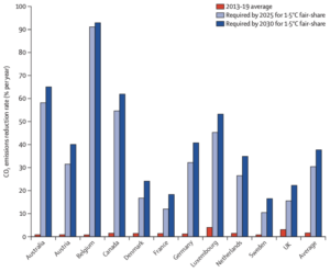 Between 2013 and 2019, of 36 rich countries for which there was appropriate data, 11 (including Australia) had achieved absolute decoupling of their GDP from their consumption-based CO2 emissions. However, not one of those 11 got within cooee of doing it fast enough for them to meet their fair share of global emissions reductions for the world to have even a 50% chance of limiting global warming to 1.5oC. Each country’s ‘fair share of emissions reductions’ was calculated by weighting the global carbon budget to stay under 1.5oC by its population size. The historical carbon debts of the 11 rich, industrialised countries were ignored, being regarded as a separate issue that is best handled through other mechanisms.
