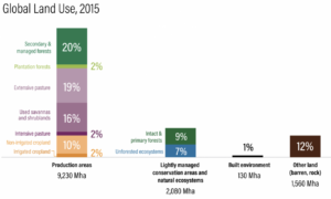 Currently, as the World Resources Institute (WRI) figure below details, over 70% of the world’s (ice-free) land surface area has been significantly impacted by humans. Although concrete, steel and glass are what many of us see most in our daily lives, the built environment occupies only about 1% of land surface area, approximately 70% is devoted to growing things that we eat, wear or inhabit.