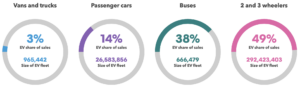The next diagram, from a different source, looks at EV sales globally in 2022 by different sorts of vehicles. Half of the EV sales were ‘2 and 3 wheelers’, a little over a third were buses and only a seventh were ‘passenger cars’.
