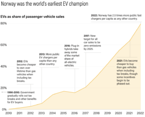 Falling costs and improving technology are obvious factors in the increasing popularity of EVs but it is government policies (incentives and infrastructure) that explain the successes of the high growth rate countries. The graph below identifies some of Norway’s actions.