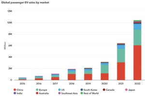 In 2022, 10% of global passenger vehicles sales were EVs (i.e., all-electric, not hybrid). In Norway it was an admirable 80%. Other than China (5% in 2020 and 22% in 2022), the only large car market to be above the global average is the EU (12%). USA (6.2%) is just over half way there, while Japan and India are both below 2%. Australia’s rate in 2022 was 4.3%. To keep global warming under 1.5oC, EVs will need to constitute 75-95% of passenger vehicles globally in 2030. This will necessitate an annual growth rate of 30%.