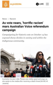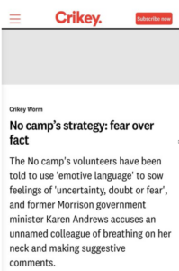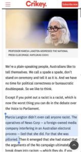 The No campaign went out looking to be offended to launch their own attack. That was what was done to Marcia Langton. No campaign’s media relations wing, NewsCorp, lied that Langton called people racist. She didn’t. This was a tactic embraced by no campaign: fear over facts.