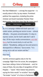 To claim the Yes campaign didn’t adequately explain its case is…meh. It is strange for people who rejected the Voice, because it would negatively impact the Constitution or operation of government, to understand THAT complex system but somehow fail to get what the Voice was about.