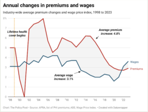 Despite the substantial government subsidies, the cost of premiums far outstrips wage growth. When the Lifetime Health Cover penalties were introduced, the Howard government promised that premium increases would come down. They did – for a year. Then they went back up and stayed there.