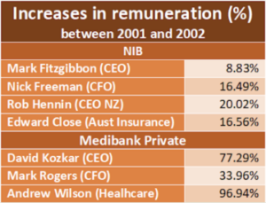 This global trend can be seen also in Australian private health insurance companies, such as NIB and Medibank Private. Top executives in these firms are earning well over $1 million a year each, and CEOs well over $3 million.