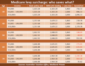 In practice, it’s complicated. There are different outcomes according to age as well as income. But to explain, look in the table below at the figures for a 50-year-old individual. A typical basic policy (in this case from Medibank Private) would cost $1,462. But if they’re newly joining, the Lifetime Health Cover penalties mean that policy will cost them $2,048.09 instead. If that person earns over $150,000 a year, they’ll be up for $3,000 in extra tax. But if they take out a basic policy, they’ll save $951.91 a year.