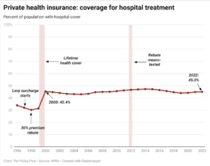 It didn’t. Some decent research might have revealed that changes to premiums have relatively little effect on uptake: in economic language, health insurance is price inelastic. Despite committing their own and future governments to a large and growing outlay, that rebate made little difference. It wasn’t until 2000 and the introduction of Lifetime Health Cover, which penalised people who didn’t join up when they were young, that the decline was turned around.