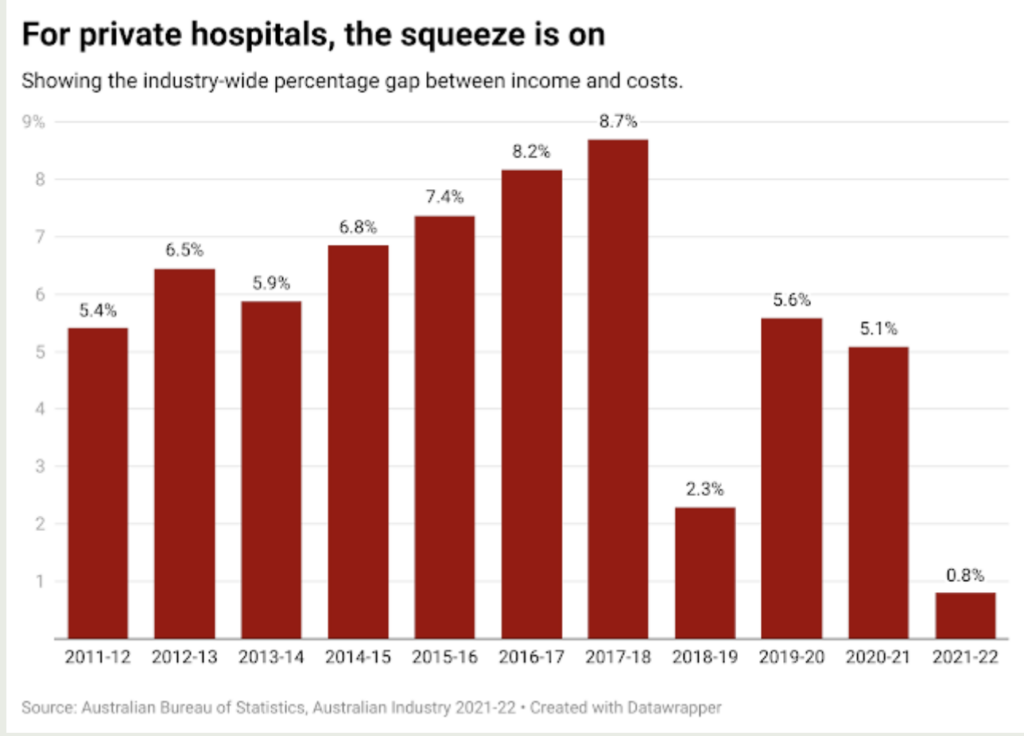 At the same time as the insurers were reaping large profits, hospitals were caught in a squeeze between rising costs and inadequate funding. According to the ABS, the gap between revenue and costs fell to 0.8% in 2021-22.