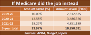 The main measure of the efficiency of any healthcare funding scheme is how much money goes to the actual delivery of care, and how much is lost to the ticket-clippers along the way. Medicare, the public insurer, provides a benchmark. In 2022-23, it got $28.25 billion from the government and paid out $27.32 billion in benefits. So administration costs took just 3.4% of its income.