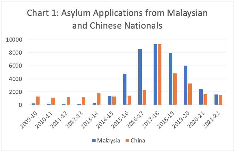 I have been writing on the growing asylum seeker numbers in this online journal and other places (including this article in the Sydney Morning Herald) since around 2017 when the labour trafficking scam was at its peak, driven by an extraordinary surge in asylum applications from Malaysian and Chinese nationals who had mostly arrived on visitor visas (see Chart 1). In 2017-18, there was a record 27,931 asylum applications, of which 18,627 (67 percent) were from just Malaysia and China.