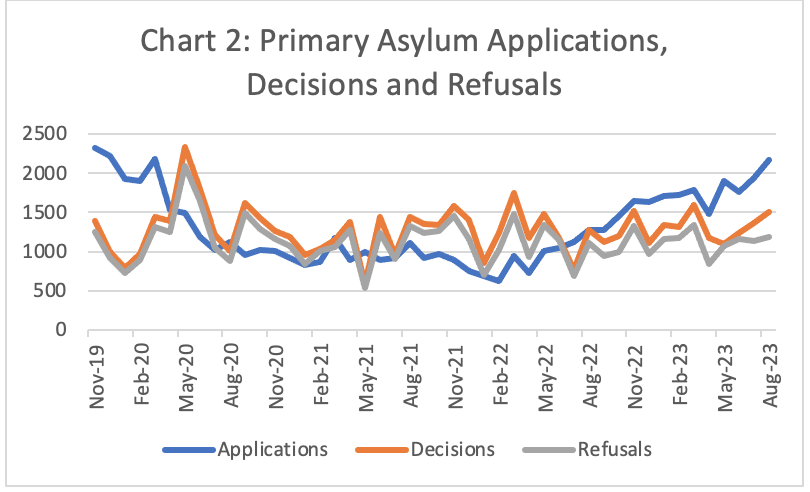 - the rise in asylum applications begin to plateau and then decline from its most recent level of 2,164 in August 2023 – that will take a number of months;
