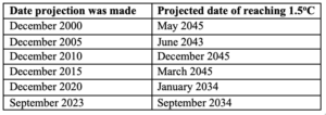 As you can see, the projection in September 2023 was that global warming will reach 1.5oC in September 2034. But even more concerning is that by using the ‘slider’ at the bottom of the online graph you can see how the projected date of arrival at our 1.5oC destiny has changed over the last 23 years. I have summarised this in the table below.