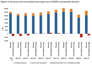Wood from native forests has been largely replaced by wood from plantations. The craziest aspect is that even with government subsidies the industry regularly makes a financial loss, clearly demonstrated by the next graph showing the financial results for the state-owned Forestry Corporation of NSW (FCNSW) for the last eleven years. In 2021-22, NSW government grants plus the operating loss totalled about $30 million. The financial results for Victoria and Tasmania are similar.